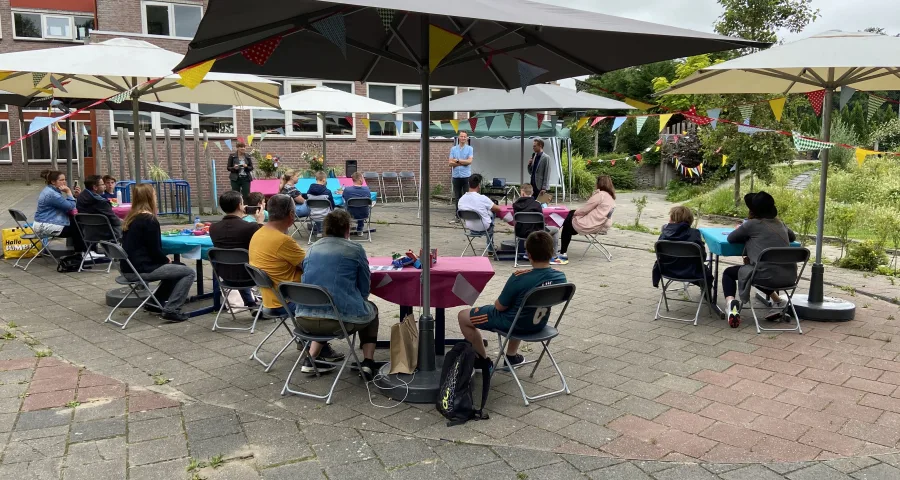In een kleine setting konden de betrokken leerkrachten afscheid nemen van de leerlingen. Het plein bij de groene heuvel was omgetoverd tot een sfeervol plein waar alles klaar stond voor een mooi afscheid.